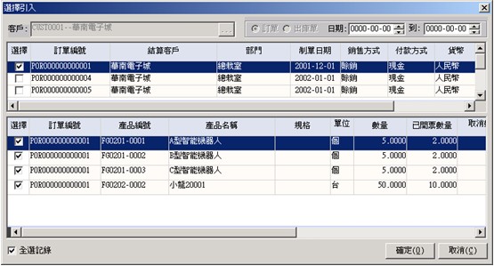 動輸資料中的運輸方式系統默認值為送貨,用戶可以維護。其它相關資料用戶可錄可不錄。 |