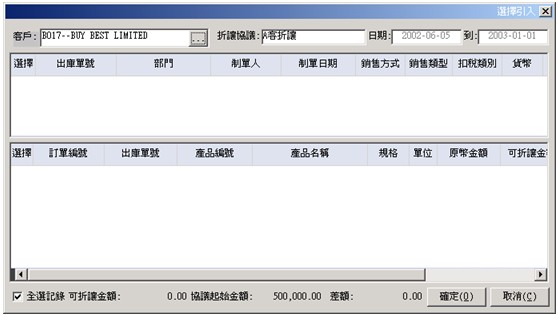 3. 如果折讓類型為普通折讓﹐則顯示如下圖的引入窗口﹐可以按銷售訂單過濾出出庫單﹐選定要進行折讓的出庫單及產(chǎn)品記錄﹐按確定﹐所選記錄會引入到折讓單錄入主接口來。