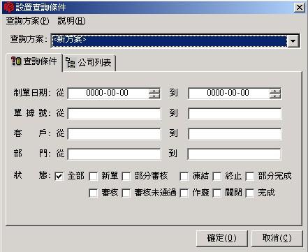 查詢方式有三種:定位、自定義查詢、查詢。查詢接口如下圖所示,接口上列有查詢條件:日期、單號﹑客戶﹑部門﹑單據(jù)狀態(tài)。可對接口上的條件進行任意組合,具體設定請參見附錄“公共操作”。