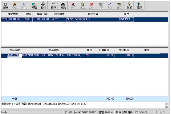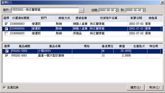 3. 在窗口中選擇客戶﹐付運通知單以及產品﹐按確定返回。所選的產品記錄會出現在補貨單錄入接口。你可以修改補貨數量。如圖