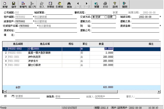 在此可以錄入補貨單。資料經審核后,則可據此進行銷售補貨出庫操作。