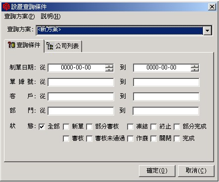 查詢方式有三種:定位、自定義查詢、查詢。查詢接口如下圖所示,接口上列有查詢條件:制單日期﹑單據號﹑客戶﹑部門﹑單據狀態。可對接口上的條件進行任意組合,具體設定請參見附錄。